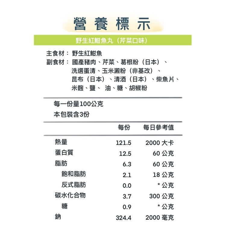 • 本產品含有魚類、芝麻及其製品(芝麻油),不適合其過敏體質者食用